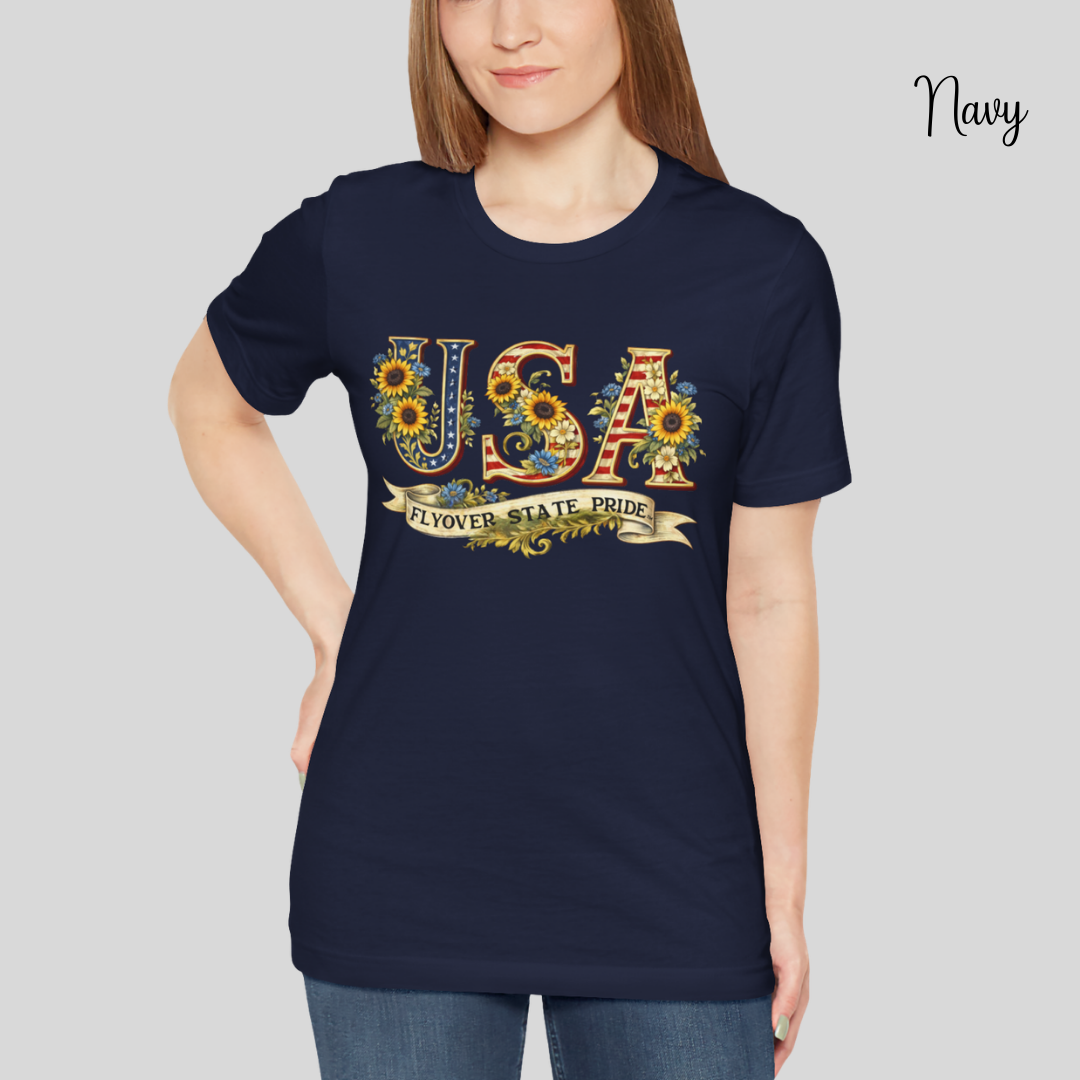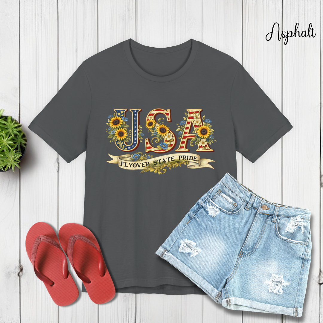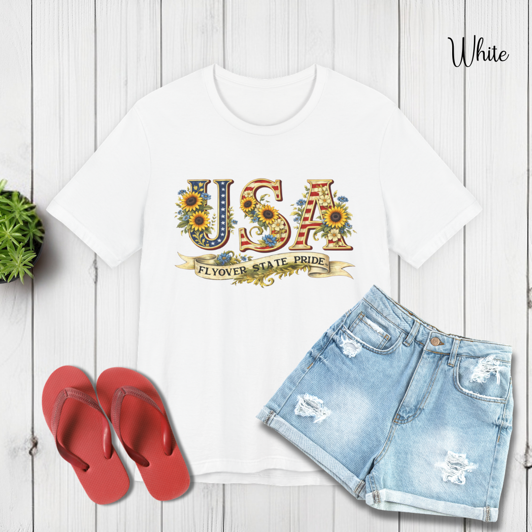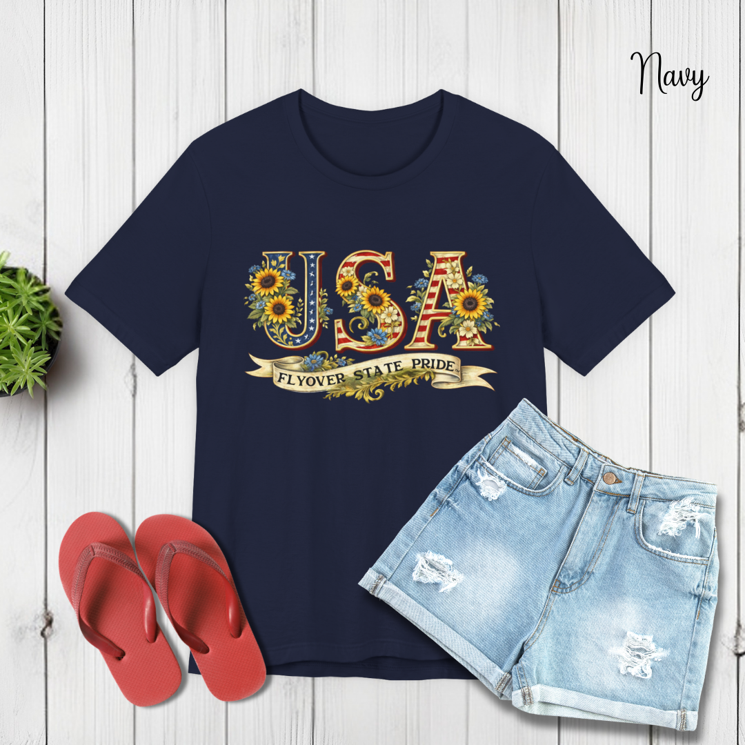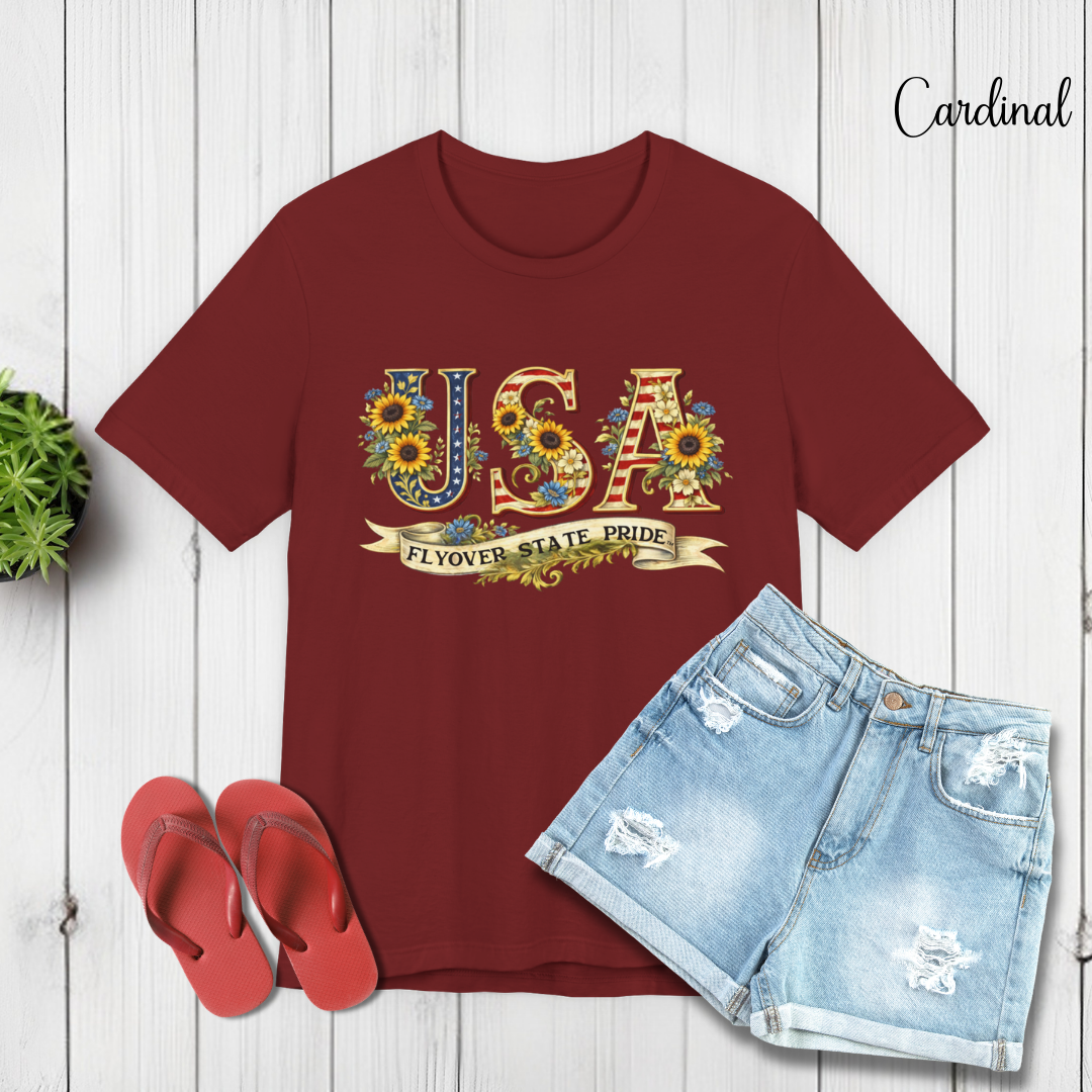 Celebrate the USA and the flyover states with this comfortable and lightweight unisex jersey t-shirt. Bold, floral-studded letters, framed by sunflowers, spell USA across the chest with a ribbon underneath that reads “Flyover State Pride.” The breathable cotton keeps you cool while the retail fit and crew neck make it easy to layer under a denim jacket or to simply wear on its own. The soft, tear-away label and responsibly made fabric add comfort that you'll notice throughout the day.