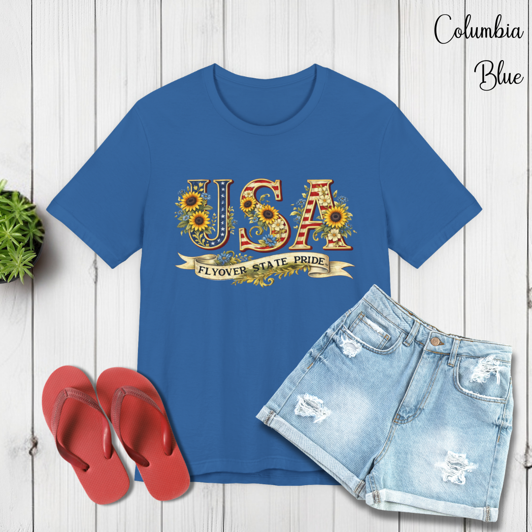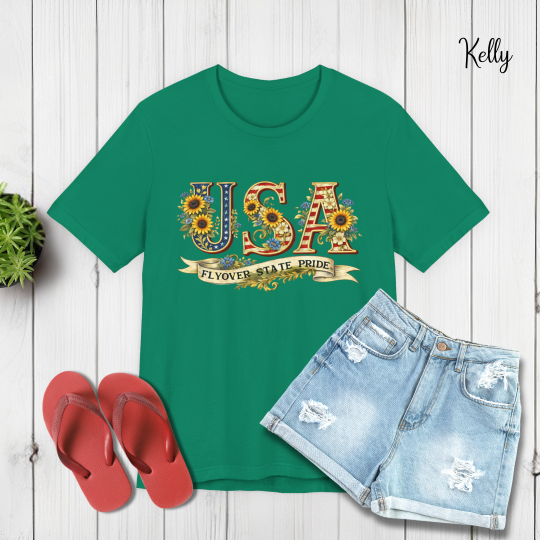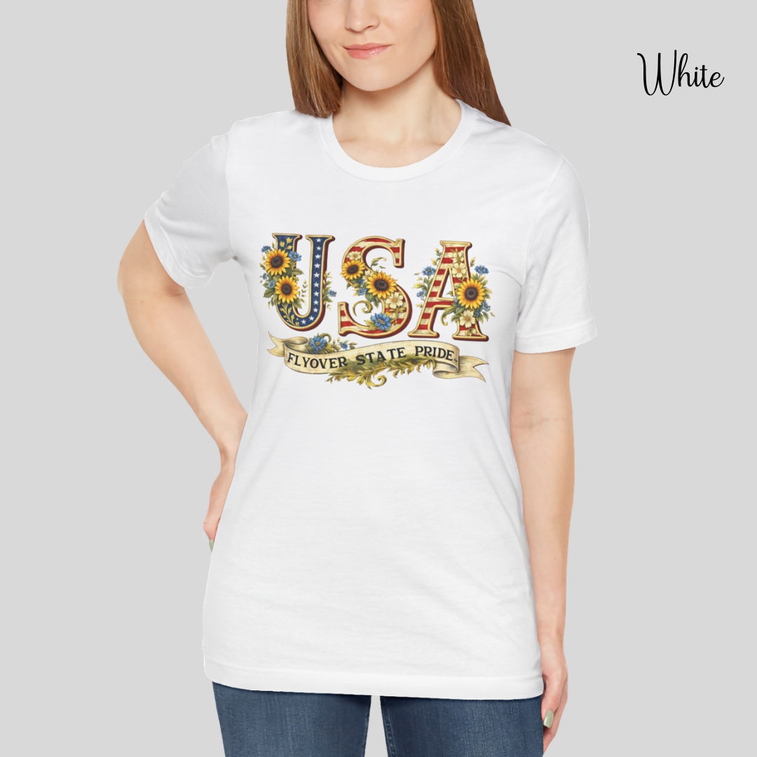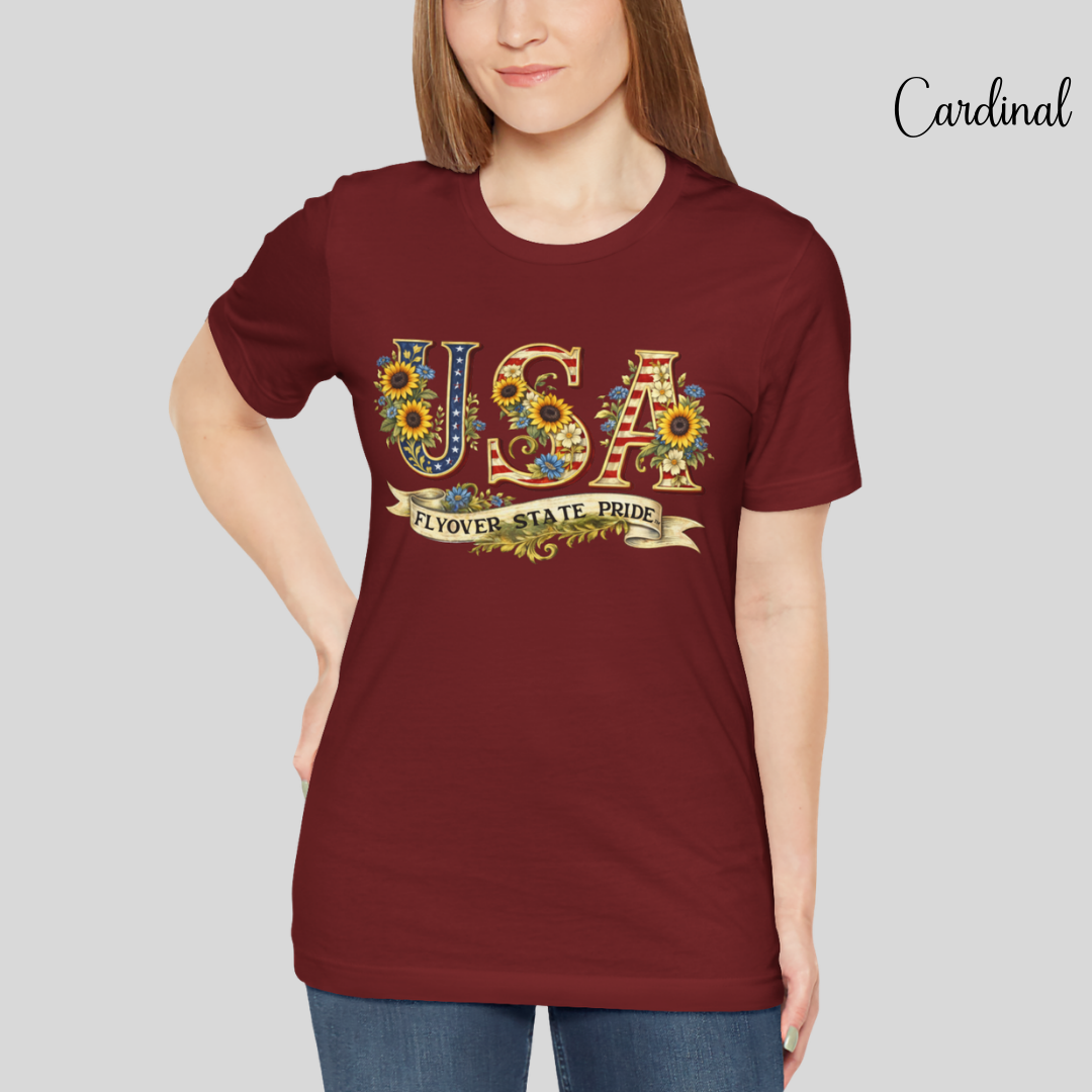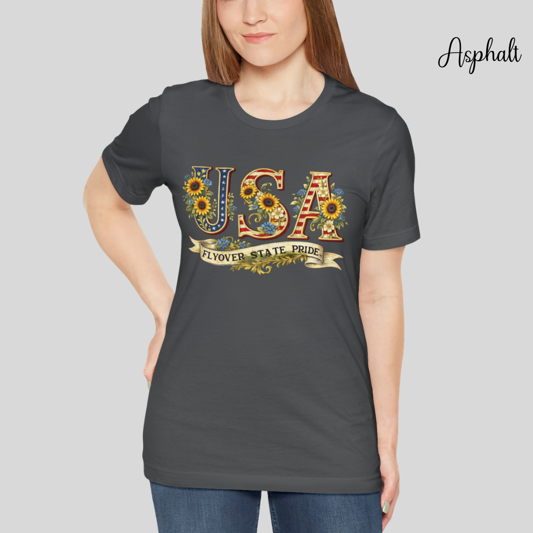 Celebrate the USA and the flyover states with this comfortable and lightweight unisex jersey t-shirt. Bold, floral-studded letters, framed by sunflowers, spell USA across the chest with a ribbon underneath that reads “Flyover State Pride.” The breathable cotton keeps you cool while the retail fit and crew neck make it easy to layer under a denim jacket or to simply wear on its own. The soft, tear-away label and responsibly made fabric add comfort that you'll notice throughout the day.