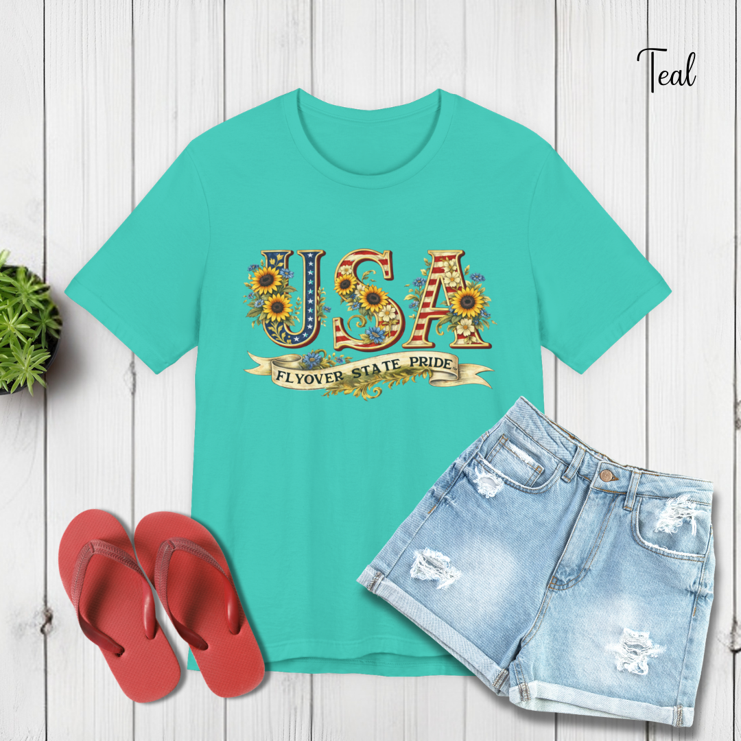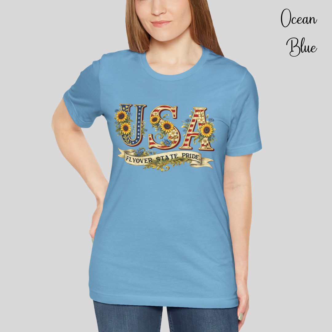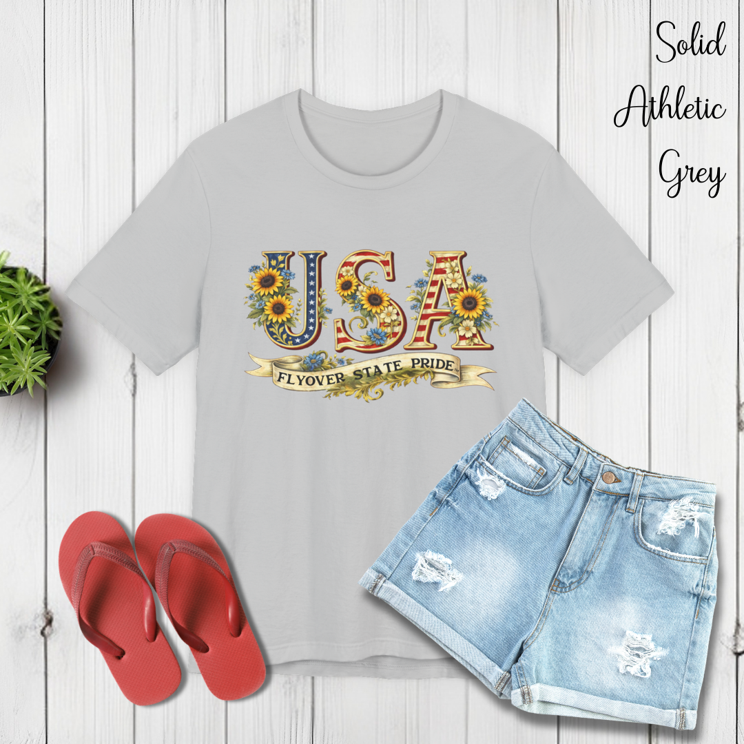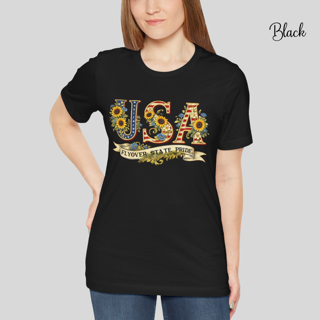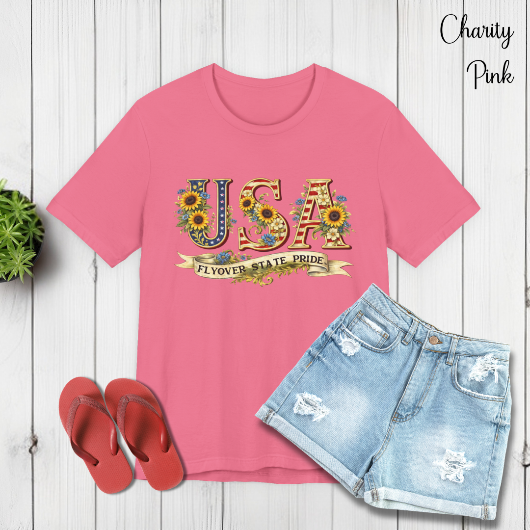 Celebrate the USA and the flyover states with this comfortable and lightweight unisex jersey t-shirt. Bold, floral-studded letters, framed by sunflowers, spell USA across the chest with a ribbon underneath that reads “Flyover State Pride.” The breathable cotton keeps you cool while the retail fit and crew neck make it easy to layer under a denim jacket or to simply wear on its own. The soft, tear-away label and responsibly made fabric add comfort that you'll notice throughout the day.