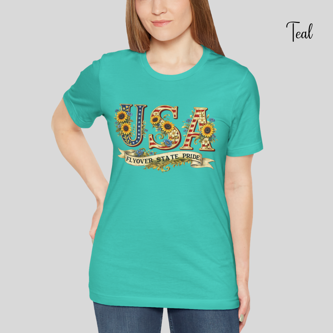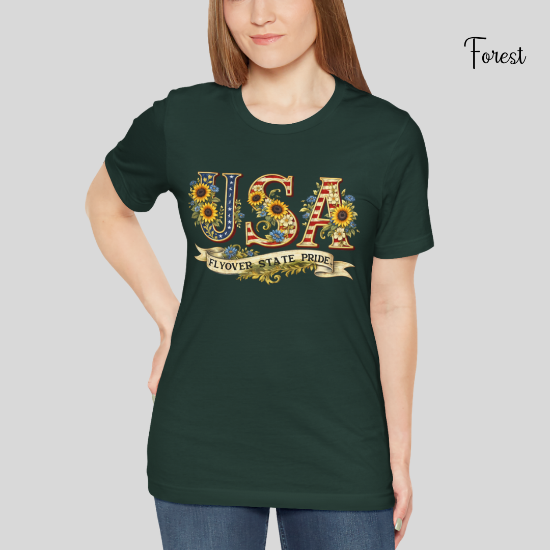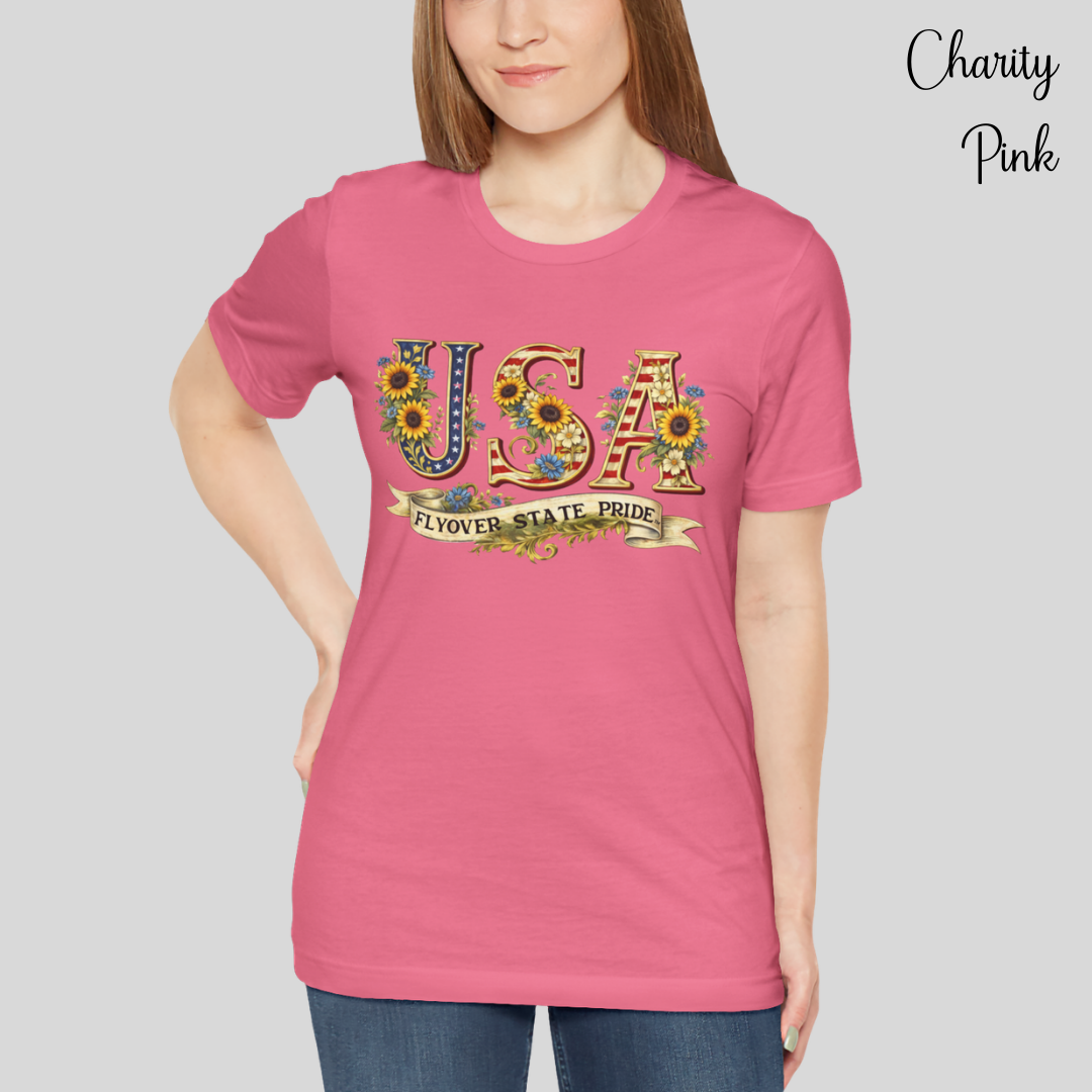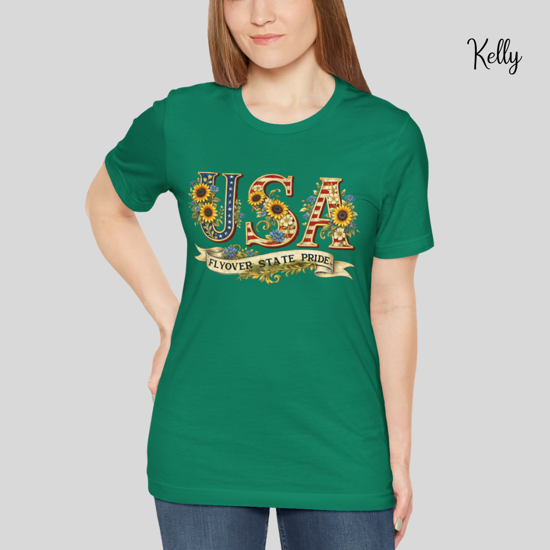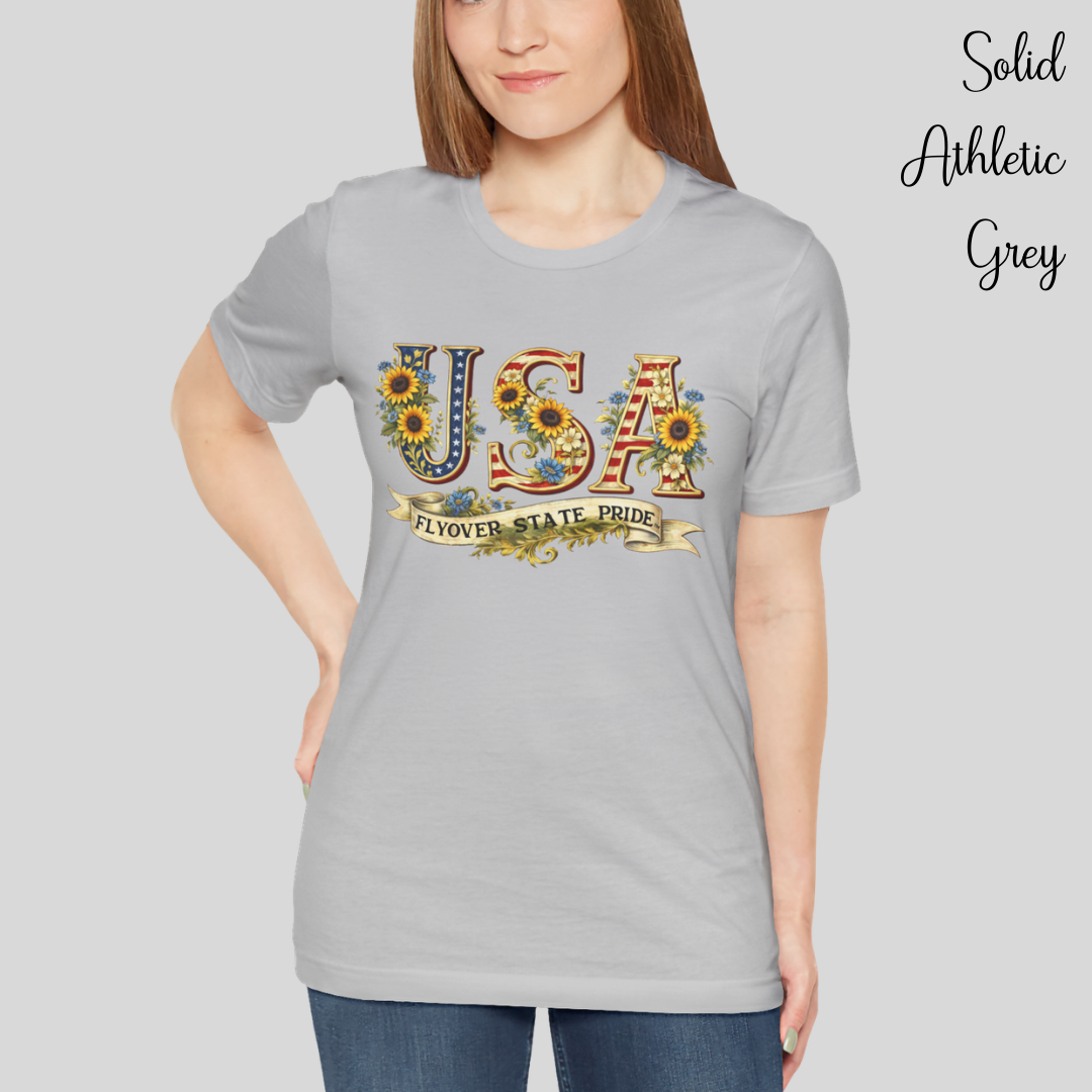 Celebrate the USA and the flyover states with this comfortable and lightweight unisex jersey t-shirt. Bold, floral-studded letters, framed by sunflowers, spell USA across the chest with a ribbon underneath that reads “Flyover State Pride.” The breathable cotton keeps you cool while the retail fit and crew neck make it easy to layer under a denim jacket or to simply wear on its own. The soft, tear-away label and responsibly made fabric add comfort that you'll notice throughout the day.